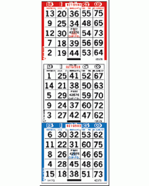 Create your own unique single, double, or triple games in this tri colored bingo cards.